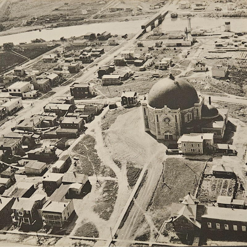 Dans le coin droit, en bas de la photo, on remarque l'ancienne chapelle. Elle se situe à notre emplacement actuelle du parc de la cathédrale et de la fontaine. À l'arrière, on voit la rivière Harricana qui a sa source près de Val-d'Or et qui se déverse, au bout de ses 533 km, dans la Baie James. Elle forme le lac de Montigny, Malartic, La Motte et Figuery.